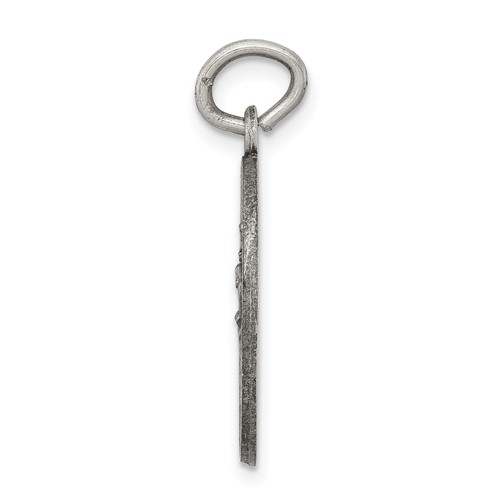Sterling silver St. Christopher medal. Measures 11/16 inch tall by 11/16 inch wide without bail. Antiqued. This item is slightly smaller than a dime. Weight: 1.75 grams. Chain not included.