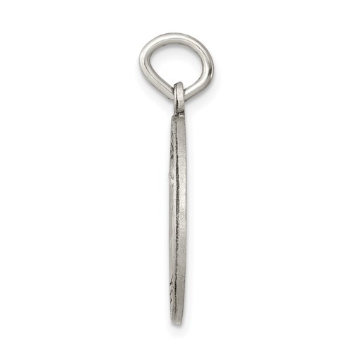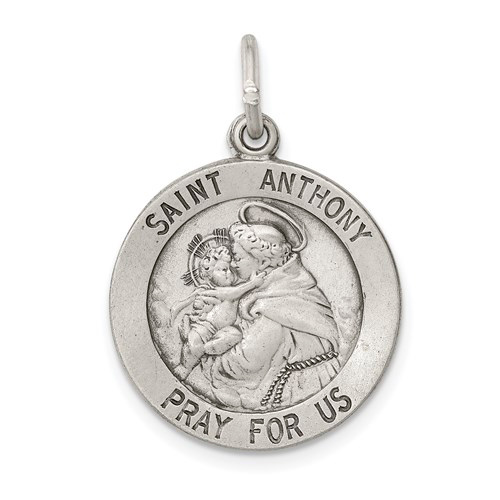 Round St Anthony medal is made of antiqued sterling silver. Dimensions: 3/4in x 3/4in wide without bail. This item is slightly smaller than a penny. St Anthony is the patron saint of lost and found and the poor.