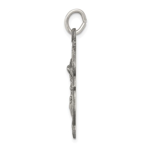 St. Michael badge medal is made of sterling silver. Measures 15/16 inch tall by 3/4 inch wide without bail. This item is the size of a nickel. Weight: 5.55 grams. Jump ring size: 2.5mm x 3mm. We recommend a chain no wider than 2.0mm. St. Michael is the patron saint of policemen and radiologists. Chain not included.