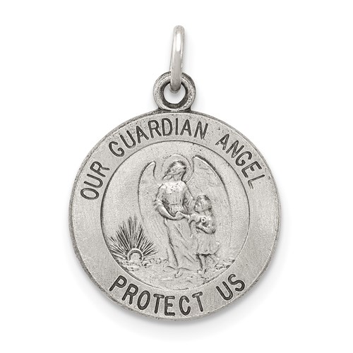 Petite, solid sterling silver guardian angel medal. Measures 1/2 inch tall by 1/2 inch wide without bail. Weight: 1.25 grams. Guardian angels are assigned by God to look over each person in this world. This item is half the size of a quarter.