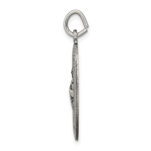 St Jude medal is made of solid, antiqued sterling silver. Oval medal measures 7/8 inch tall by 9/16 inch wide without bail. Patron saint of hospitals and lost causes. Chain not included.