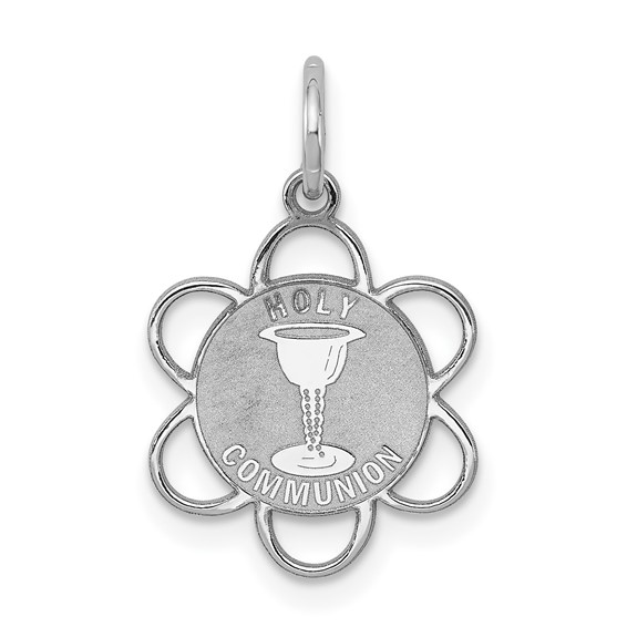 This very small Holy Communion charm is made of polished sterling silver. Item size: 1/2 inch tall by 1/2 inch wide without bail. This item is half the size of a quarter. Laser etched. Engravable on the back. Weight: 0.5 grams. Made in the USA.