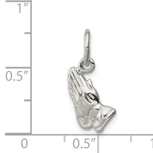 This very small praying hands charm is made of solid sterling silver. Weight: 0.87 grams. Measures 1/2 inch tall by 1/4 inch wide without bail. This charm is half the size of a quarter. Flat back. Made in the USA.