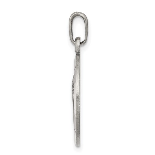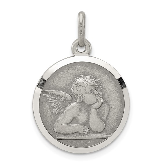 This round Raphael angel medal is made of antiqued sterling silver. This round medal is 11/16in x 11/16in without bail. Made in Italy. Weight: 3 grams.