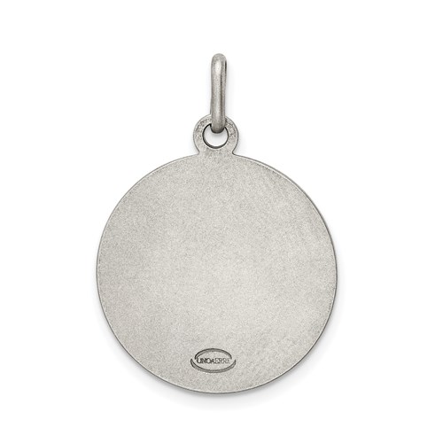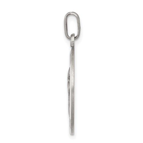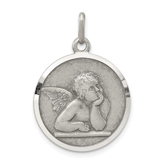This round Raphael angel medal is made of antiqued sterling silver. Item size: 3/4 inch tall by 3/4 inch wide without bail. Weight: 3.4 grams. Made in Italy.