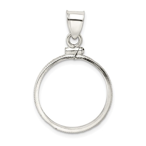 Sterling silver bezel pendant fits nickels. The bezel opens at the top with a small screw. Dimensions: 21.1mm x 2mm. Weight: 1.25 grams.
