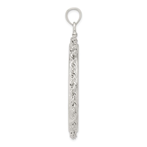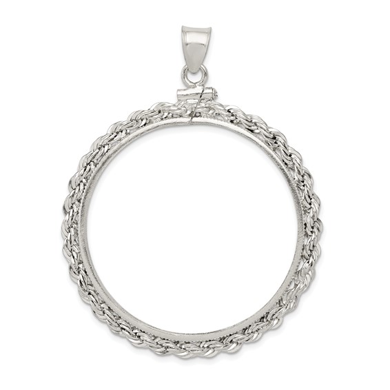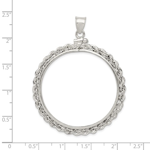 This American dollar rope coin bezel pendant is made of polished sterling silver. Screw top. Dimensions: 38.2mm x 2.8mm. This bezel fits Liberty and Morgan dollars. COIN NOT INCLUDED. Weight: 6.3 grams. Made in USA.