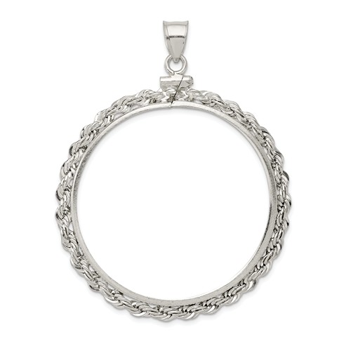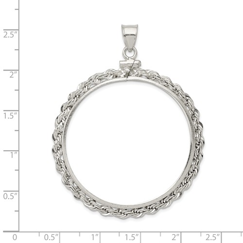 40.6mm x 3.1mm rope coin bezel pendant is made of polished sterling silver. Screw top makes it easy to open and close the bezel to fit your coin. This pendant fits 1 oz American eagle silver dollars [minted 1986 to present]. This bezel also fits these coins: 1 oz Australian silver Koalas, 1 oz Australian silver Kookaburras, 1 oz Chinese silver Pandas, 1 oz Mexican silver Libertads, 1 oz Niue Hawksbill Turtles. Made in the USA. Coin not included.