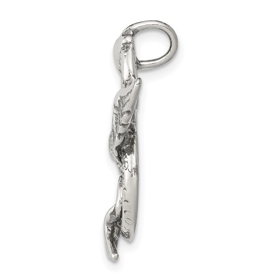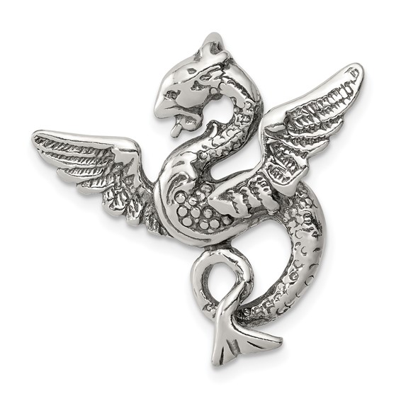 Dragon charm is made of antiqued sterling silver. Weight: 3.5 grams. Chain slide. Measures 1 inch tall by 1 inch wide. Hidden bail fits up to a 2mm wide chain.