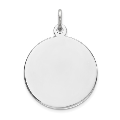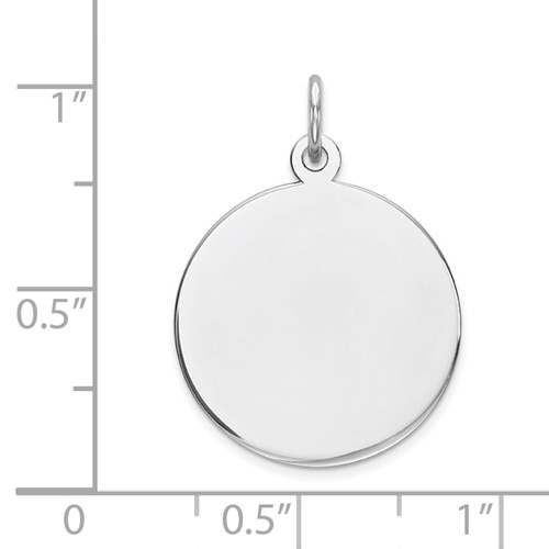 Engravable round disc charm is made of sterling silver. Polished front and satin finish back. Dimensions: 5/8 inch tall by 5/8 inch wide without bail. This item is slightly smaller than a dime. Weight: 1.21 grams. Thickness: .018in. Made in USA.