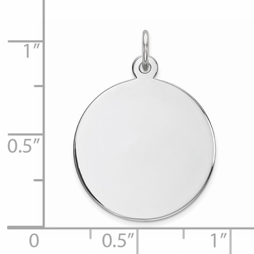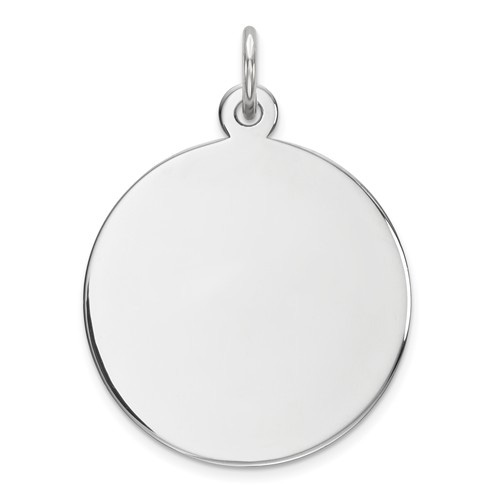 This engravable round charm is made of polished sterling silver. Item size: 3/4in x 3/4in without bail. Weight: 1.37 grams. .018 inches thick. Made in the USA.