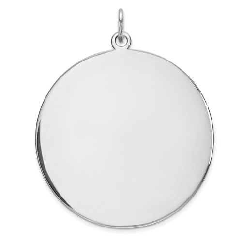 Engravable round charm is made of polished sterling silver. Satin finish on the back. Dimensions: 1 1/8 inch tall by 1 1/8 inch wide without bail. Weight: 5.9 grams. Thickness: .035in. Made in USA.