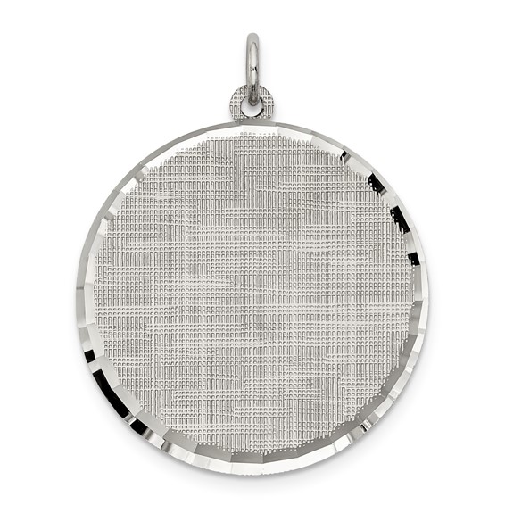 Engravable round patterned pendant is made of sterling silver. Can only be engraved on back of charm. Weight: 2.5 grams. .018 inches thick. Measures 15/16 inch tall by 15/16 inch wide without bail. Made in USA.