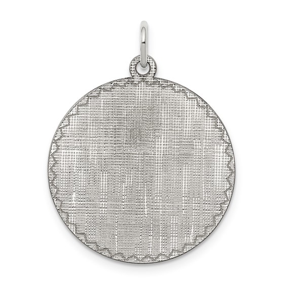 Engravable round patterned charm is made of sterling silver. Engravable on the smooth back only. Dimensions: 7/8in x 7/8in without bail. Weight: 1.87 grams. Thickness: .018in. Jump ring fits up to a 3mm wide chain. Made in USA.