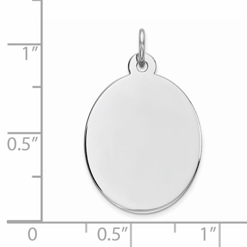 Engravable oval disc charm is made of polished sterling silver. Measures 3/4in inch tall by 5/8 inch wide without bail. Weight: 1.25 grams. Thickness: .018in. Jump ring fits up to a 3mm wide chain. Made in USA.