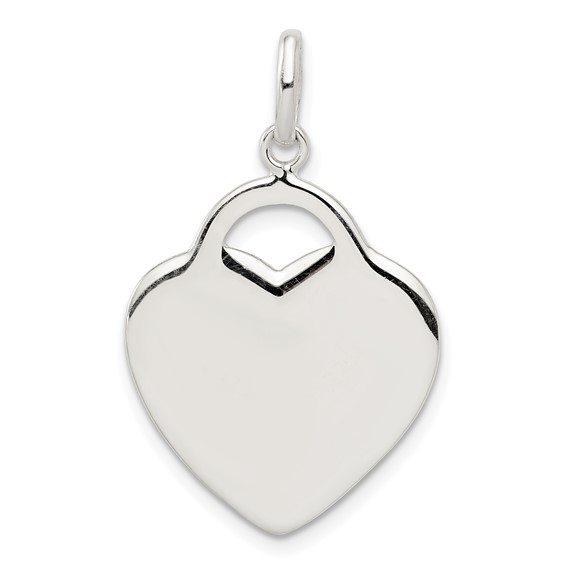 This engravable heart charm is made of polished sterling silver. Weight: 3.01 grams. Measures 3/4 inch tall by 11/16 inch wide without bail. Import.