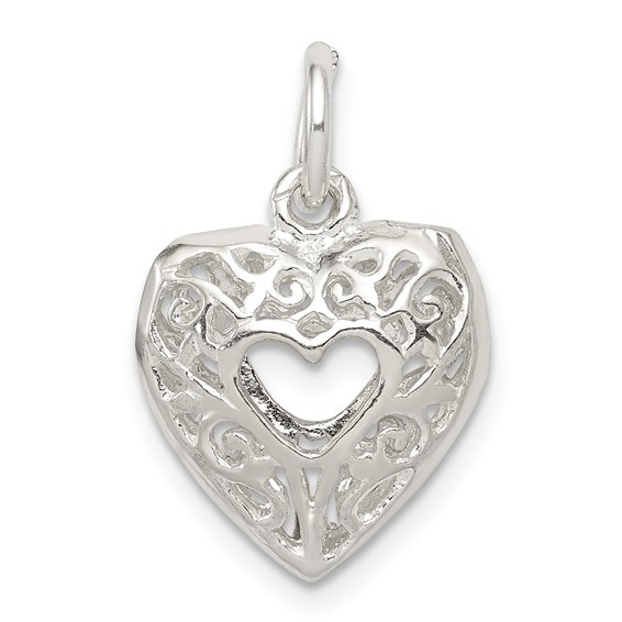 Sterling Silver Filigree Heart Charm. Weight:1.2 grams. Measures 7/16 inch tall by 7/16 inch wide without bail.