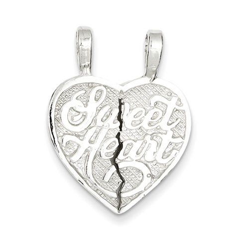 2-piece break apart heart charm is made of sterling silver. Weight: 3.2 grams. Measures 3/4 inch tall by 3/4 inch wide without bail. This item is the size of a penny. Chain not included.