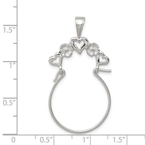 This floral heart charm holder is made of polished sterling silver. Item size: 1 1/4 inch tall by 3/4 inch wide without bail. Weight: 1.37 grams.