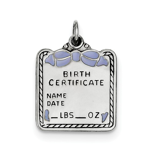 Blue birth certificate charm is made of polished sterling silver. Weight: 2.2 grams. Measures 5/8 inch tall by 5/8 inch wide without bail. This item is smaller than a dime.