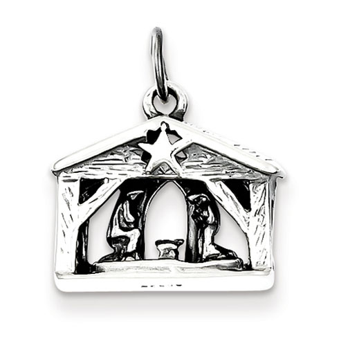 Sterling Silver Antiqued Manger Charm. Weight: 2 grams. Measures 7/16 inch tall by 5/8 inch wide without bail. This item is half the size of a quarter. Made in the USA.