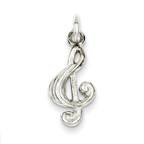 Sterling silver treble clef charm is available while supplies last. Measures 11/16 inch tall by 5/16 inch wide without bail. Weight: 1.5 grams. Made in USA.