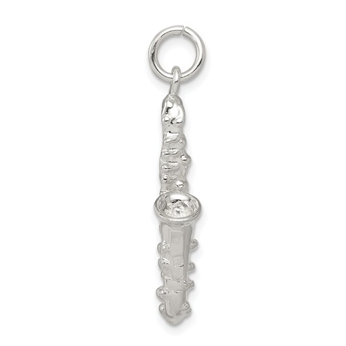Finely detailed saxophone charm is made of sterling silver. Measures 7/8 inch tall by 1/2 inch wide without bail. Three dimensional. Weight: 2.9 grams. Made in USA.