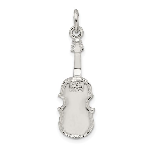 Violin pendant is made of polished solid sterling silver. Measures 1 inch tall by 5/16 inch wide without bail. Fits up to a 2.5mm wide chain. Weight: 3.25 grams.