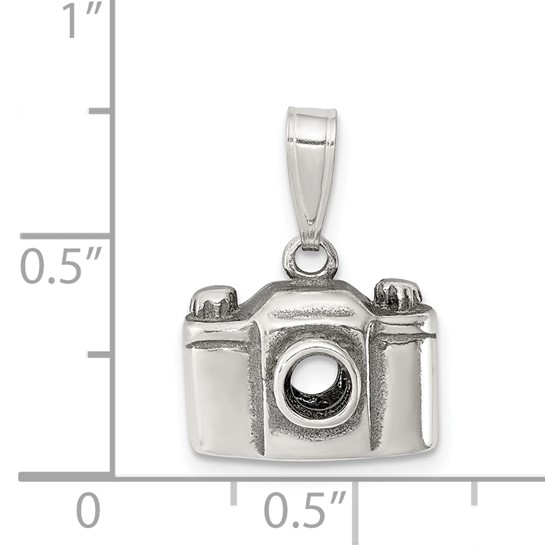 Sterling silver camera charm has an antique finish. Weight:3.01 grams. Measures 1/4 inch tall by 1/2 inch wide without bail. Fits up to a 2.5mm wide chain. Made in India. Ships from USA.