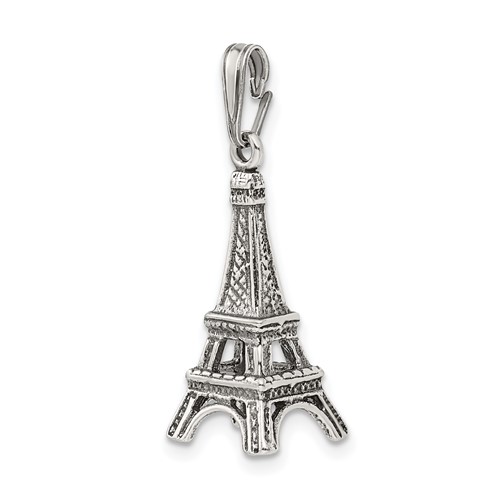Three dimensional Eiffel tower pendant is made of polished sterling silver. Weight: 2.75 grams. Measures 7/8 inch tall by 3/8 inch wide without bail.