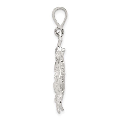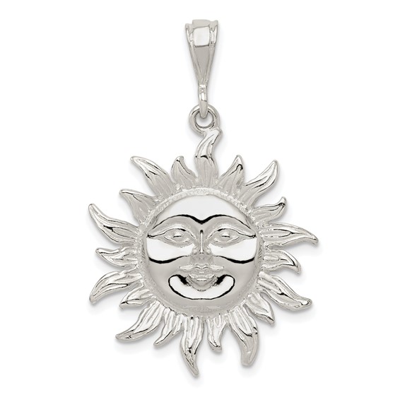 This blazing sun pendant is made of solid sterling silver. Measures 1 inch tall by 7/8 inch wide without bail. Weight: 3 grams. Made in USA.