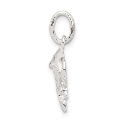 This small sterling silver dolphins charm has a jump ring. Measures 1/2 inch tall by 5/8 inch wide. Weight: 1.1 grams.