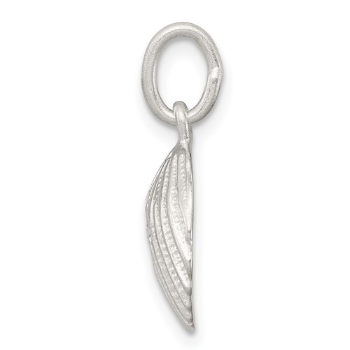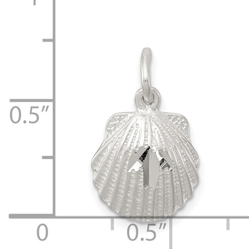 Satin finish diamond-cut shell charm is made of solid sterling silver. Measures 7/16 inch tall by 7/16 inch wide. Weight: 1.2 grams. Fits up to a 3mm wide chain. Made in India. Ships from USA.