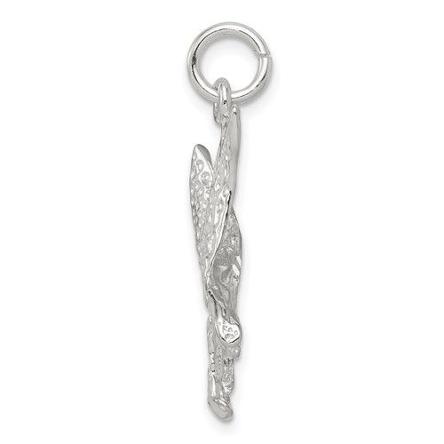 Diamond-cut perched eagle charm is made of polished sterling silver. Measures 7/8 inch tall by 1/2 inch wide. Weight: 1.7 grams. Made in the USA.