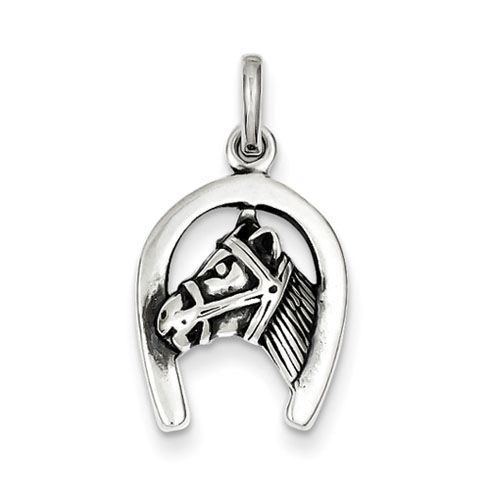Sterling Silver Antiqued Horse in Horseshoe Charm. Weight:1.87 grams. Measures 5/8 inch tall by 7/16 inch wide.