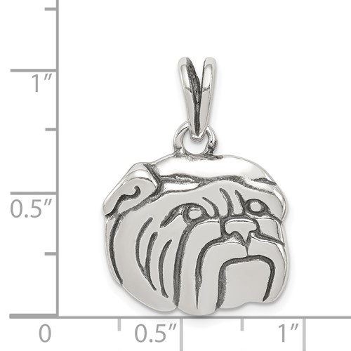 Sterling silver bulldog charm has an antique finish. Dimensions: 9/16 inch tall by 5/8 inch wide. Weight: 3.5 grams. This item is smaller than a dime.