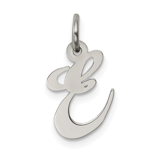 Sterling Silver Small Fancy Script Initial E Charm. Weight:0.4 grams. Measures 3/8 inch tall. This item is half the size of a penny.