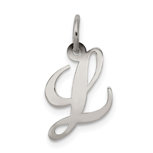 Small fancy script initial L charm is made of sterling silver. Weight: 0.4 grams. Measures 3/8 inch tall. This item is half the size of a penny.