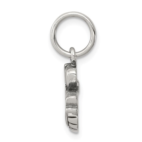 Sterling silver antiqued I Love Volleyball charm. Weight: 1.37 grams. Measures 7/16 inch tall by 9/16 inch wide.
