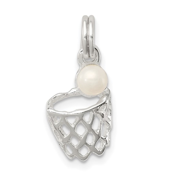 Sterling Silver Synthetic Pearl Basketball in Hoop Charm. Weight: 1 gram. Measures 1/2 inch tall by 5/16 inch wide.