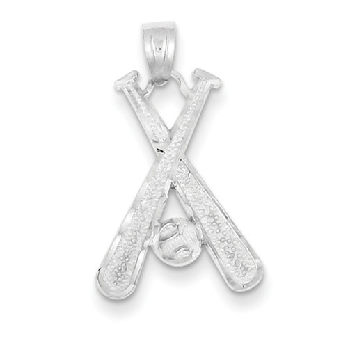 Crossed baseball bats with ball charm is made of polished sterling silver. Measures 3/4 inch tall by 1/2 inch wide. Weight: 0.6 grams.