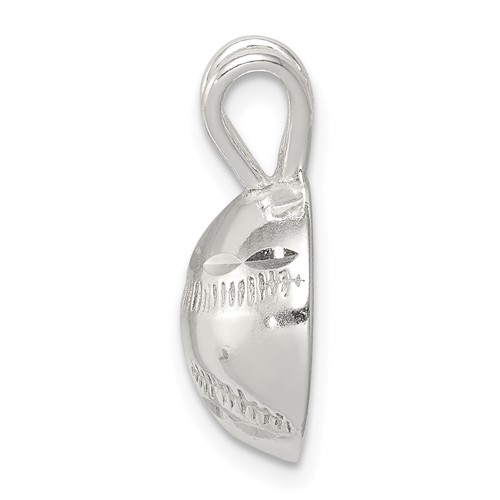 This tiny sterling silver baseball charm has an open back. Measures 3/8 inch tall by 3/8 inch wide. Weight: 1.2 grams.