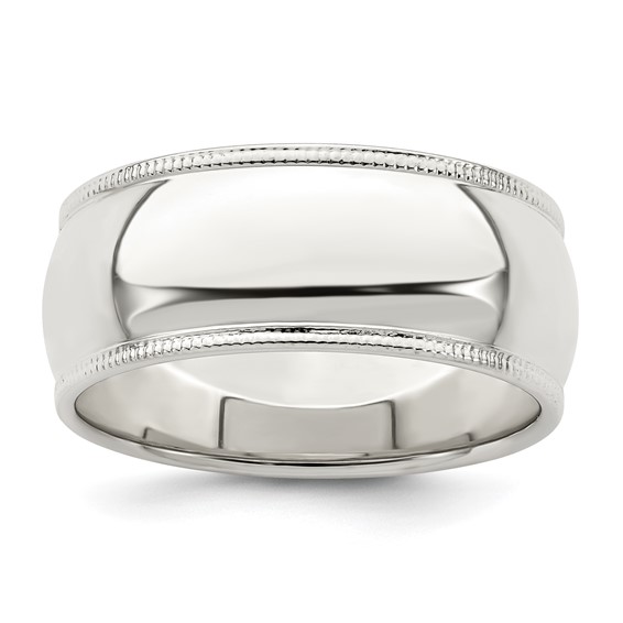 Polished sterling silver oval milgrain wedding band is standard fit. Width: 9mm. Thickness: 2mm. Available in whole and half finger sizes only. Made in the USA.