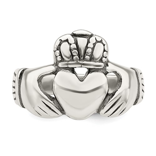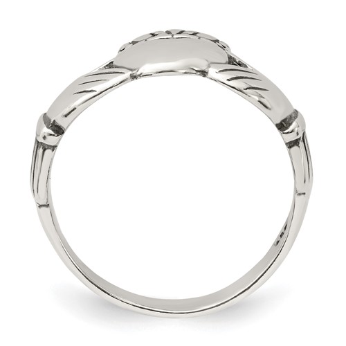 This ladies' sterling silver claddagh ring has an antique finish. Available in sizes 6, 7 and 8. Weight:3.5 grams.