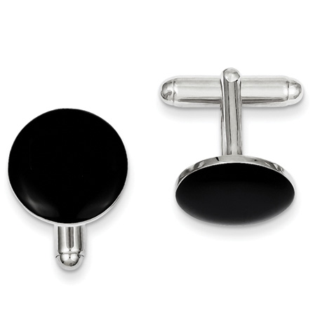 Round black enameled cuff links are made of sterling silver. Measures 5/8 inch by 5/8 inch. Weight: 6.8 grams. Made in Italy.