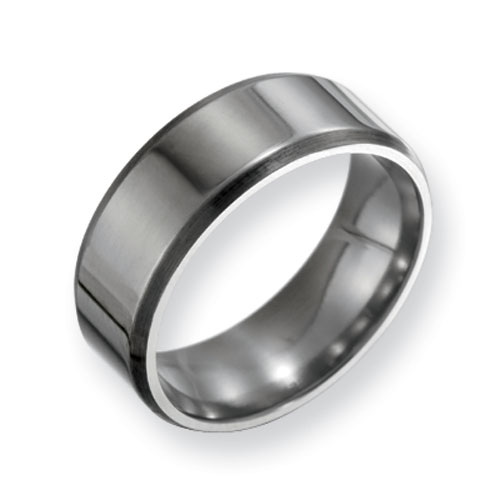 This wide titanium ring has a flat polished center with brushed beveled edges. Width: 8mm. Made of aircraft grade titanium in China. Comfort fit. Aircraft grade titanium [Ti 6Al-4V] is comprised of 90% titanium, 6% aluminum, 4% vanadium. It is hypoallergenic and guaranteed not to cause allergic reactions, skin irritations or discoloration of any sort. While pure grades of titanium [99.9%] used in most other titanium jewelry is very durable, Ti 6Al-4V is 2x stronger and 2.5x to 5x harder. This alloy has a tensile strength of up to 150,000 psi and a Brinell hardness value of 330.