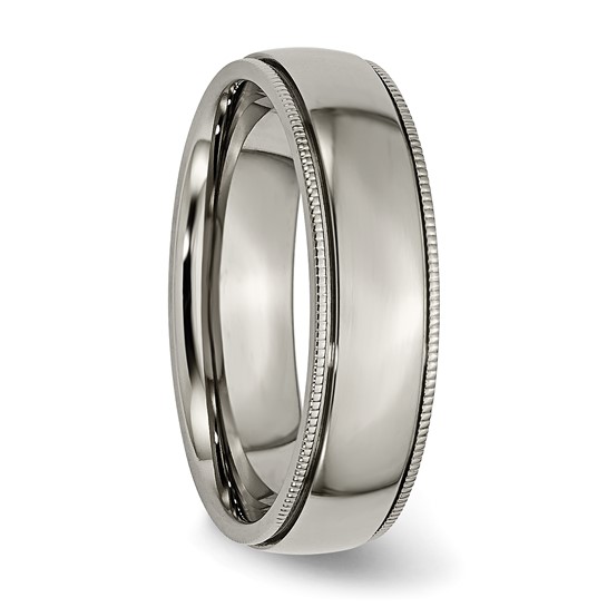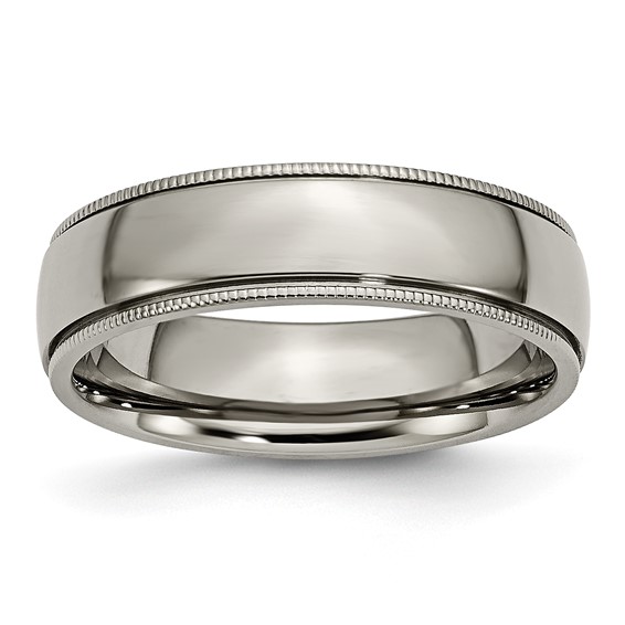 Titanium ring has a flat center with milgrain edges. Width: 6mm. Polished finish. Made of aircraft grade titanium. Comfort fit. Import.Aircraft grade titanium [Ti 6Al-4V] is comprised of 90% titanium, 6% aluminum, 4% vanadium. It is hypoallergenic and guaranteed not to cause allergic reactions, skin irritations or discoloration of any sort. While pure grades of titanium [99.9%] used in most other titanium jewelry is very durable, Ti 6Al-4V is 2x stronger and 2.5x to 5x harder. This alloy has a tensile strength of up to 150,000 psi and a Brinell hardness value of 330.