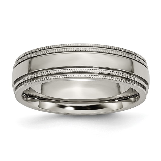 Titanium ring has a polished finish, flat center. Beaded grooves. Width: 6mm. Made of aircraft grade titanium. Comfort fit. Aircraft grade titanium [Ti 6Al-4V] is comprised of 90% titanium, 6% aluminum, 4% vanadium. It is hypoallergenic and guaranteed not to cause allergic reactions, skin irritations or discoloration of any sort. While pure grades of titanium [99.9%] used in most other titanium jewelry is very durable, Ti 6Al-4V is 2x stronger and 2.5x to 5x harder. This alloy has a tensile strength of up to 150,000 psi and a Brinell hardness value of 330.
