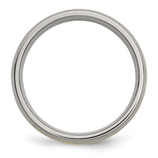 Titanium ring has a polished flat center with 14k yellow gold inlay. Brushed edges. Width: 6mm. Made of aircraft grade titanium in China. Comfort fit. Aircraft grade titanium [Ti 6Al-4V] is comprised of 90% titanium, 6% aluminum, 4% vanadium. It is hypoallergenic and guaranteed not to cause allergic reactions, skin irritations or discoloration of any sort. While pure grades of titanium [99.9%] used in most other titanium jewelry is very durable, Ti 6Al-4V is 2x stronger and 2.5x to 5x harder. This alloy has a tensile strength of up to 150,000 psi and a Brinell hardness value of 330.