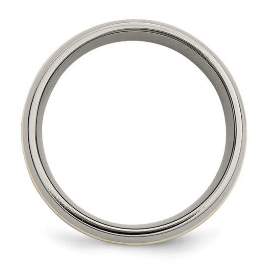Polished finish, two 14k yellow gold inlays. Width: 10mm. Made of aircraft grade titanium in China. Comfort fit. Aircraft grade titanium [Ti 6Al-4V] is comprised of 90% titanium, 6% aluminum, 4% vanadium. It is hypoallergenic and guaranteed not to cause allergic reactions, skin irritations or discoloration of any sort. While pure grades of titanium [99.9%] used in most other titanium jewelry is very durable, Ti 6Al-4V is 2x stronger and 2.5x to 5x harder. This alloy has a tensile strength of up to 150,000 psi and a Brinell hardness value of 330.